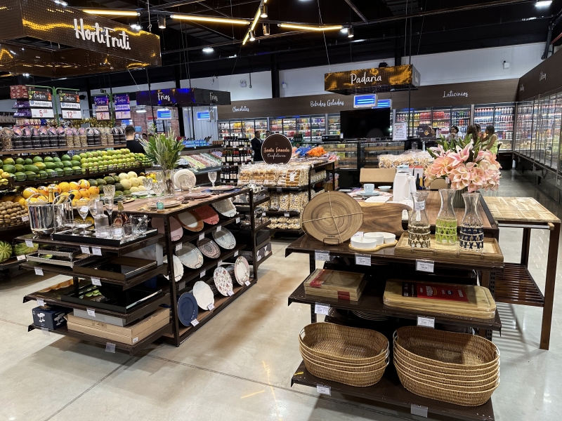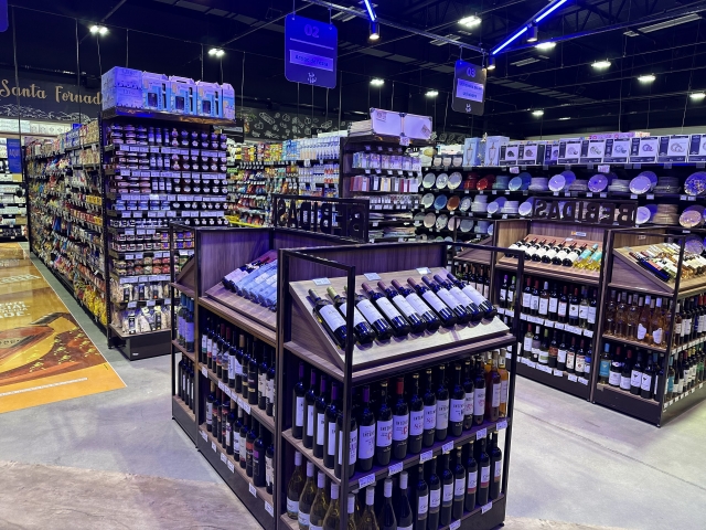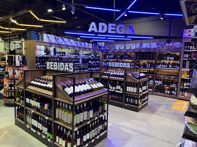 Na entrada, uma gôndola de vidro separa os checkouts e forma uma adega em ‘L’ e pergolado, com muito muito mais espaço para bebidas, além de expositores baixos. Toda a adega tem iluminação marcante em LED. Tem ainda um expositor de vinho diferenciado, a Bailarina, com capacidade para 252 garrafas.