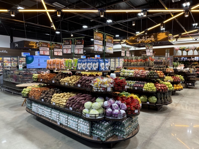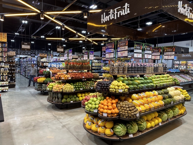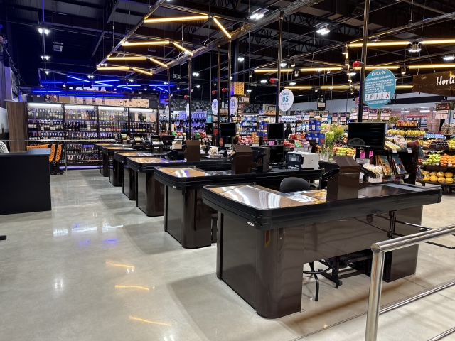 Todos os checkouts são eletrônicos com esteira e ergonomia, ancorados pela bateria de check-stands.