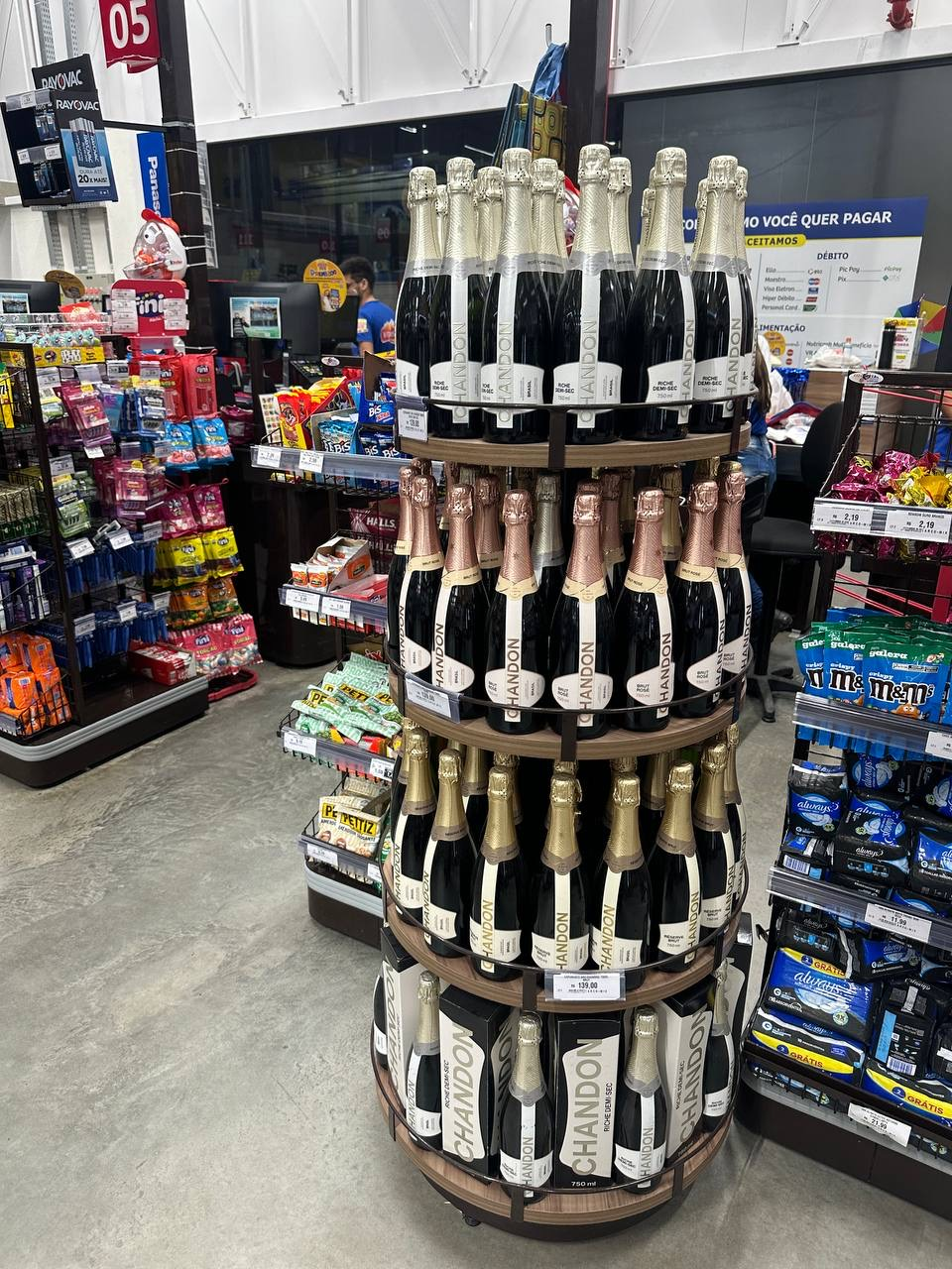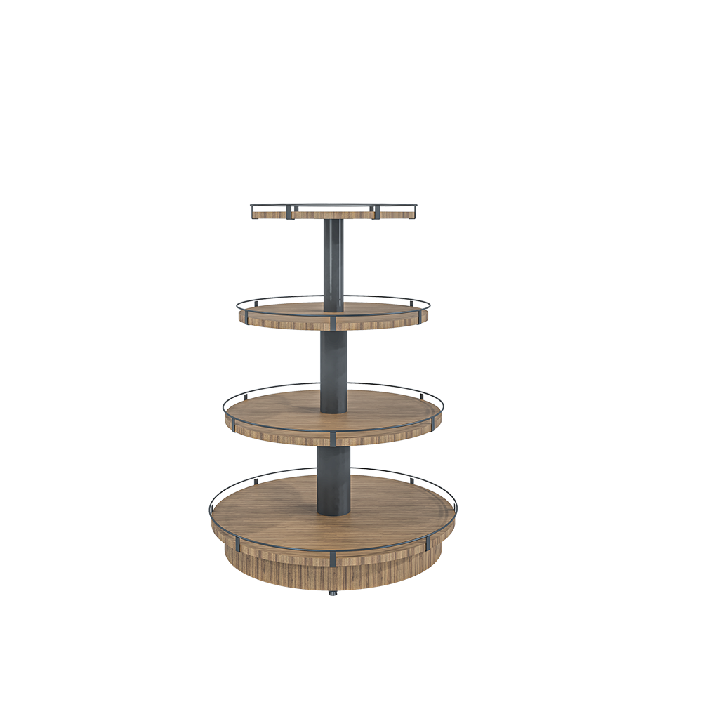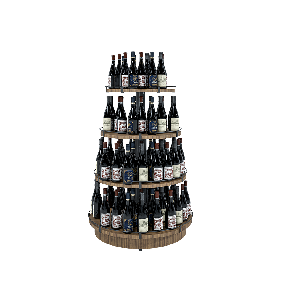 Expositor central para bebidas, confeccionado em estrutura de aço carbono, revestido em MDF, com 4 níveis de exposição e pés niveladores de altura.