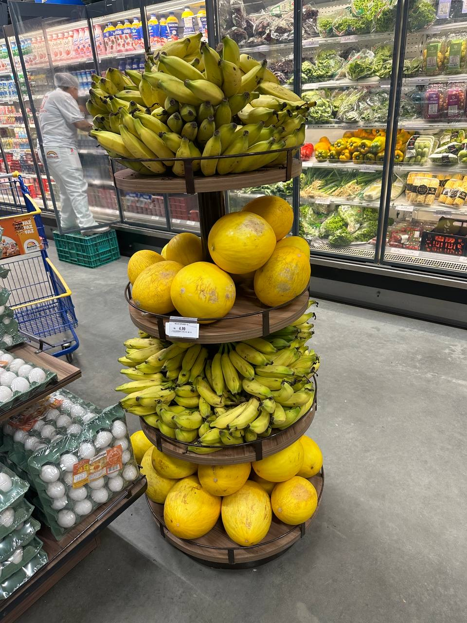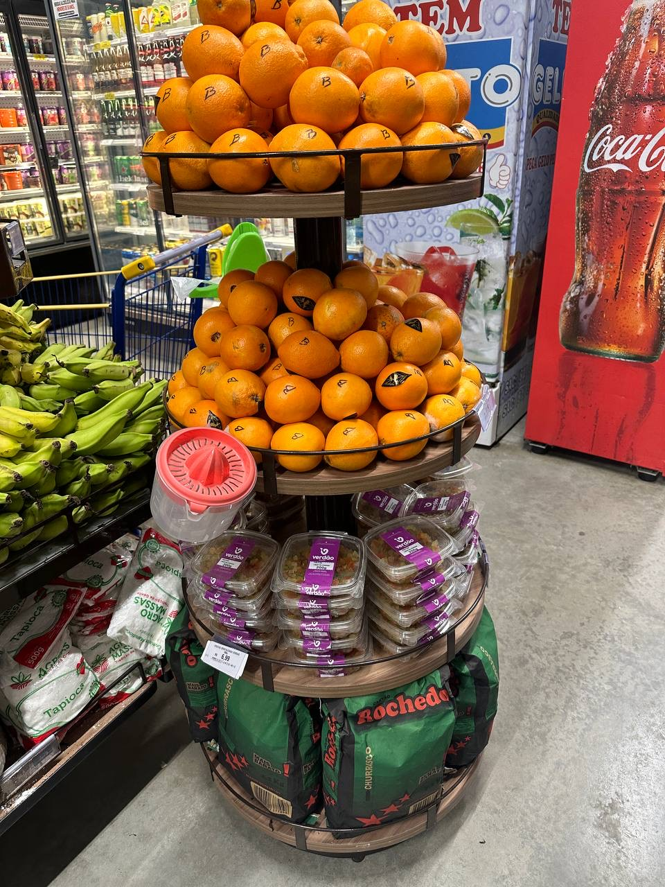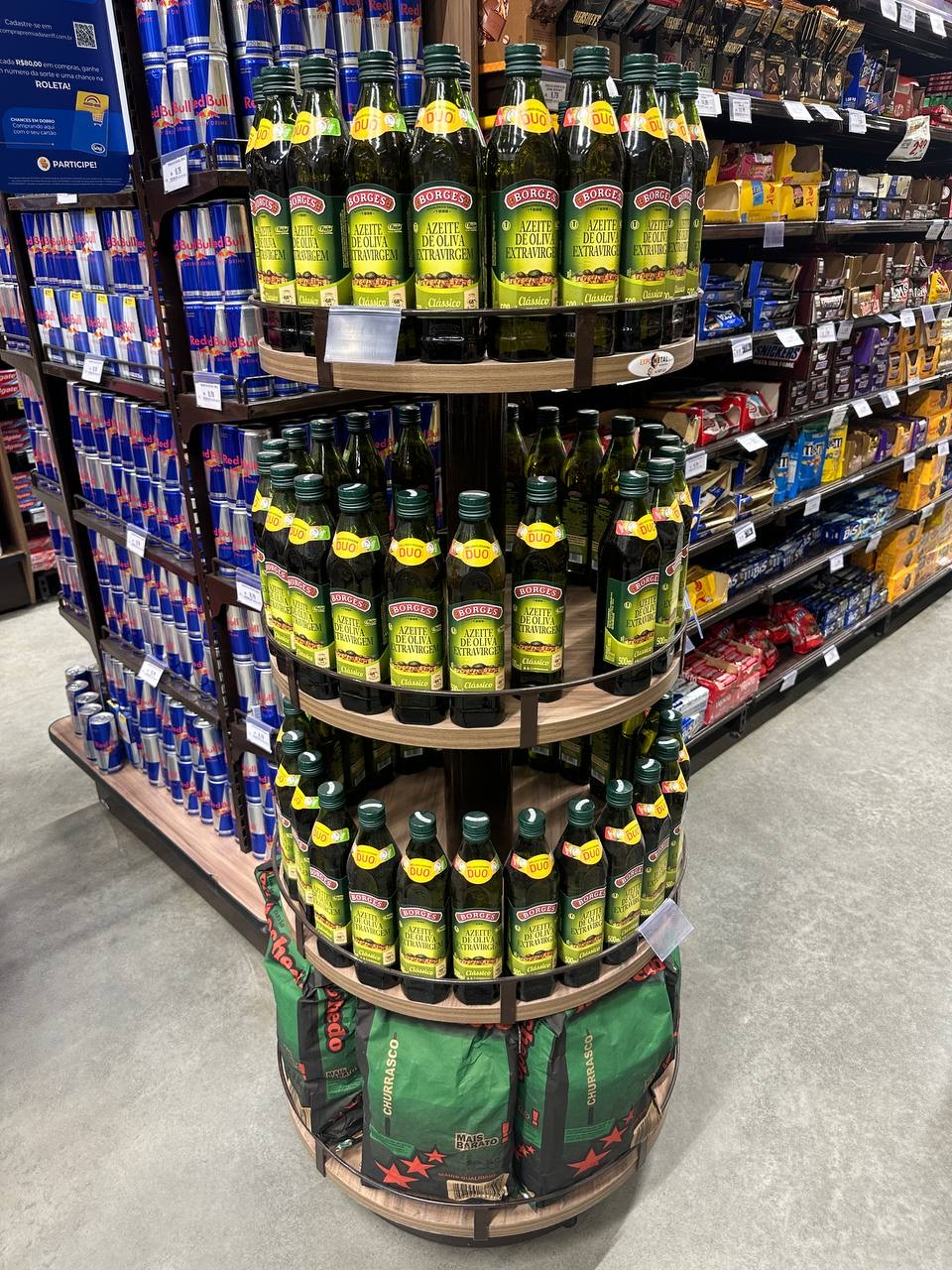 Expositor central para bebidas, confeccionado em estrutura de aço carbono, revestido em MDF, com 4 níveis de exposição e pés niveladores de altura.