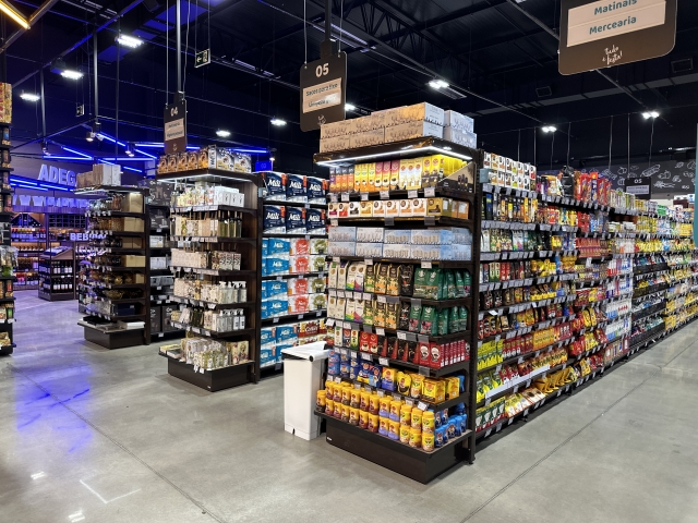Na entrada, uma gôndola de vidro separa os checkouts e forma uma adega em ‘L’ e pergolado, com muito muito mais espaço para bebidas, além de expositores baixos. Toda a adega tem iluminação marcante em LED. Tem ainda um expositor de vinho diferenciado, a Bailarina, com capacidade para 252 garrafas.