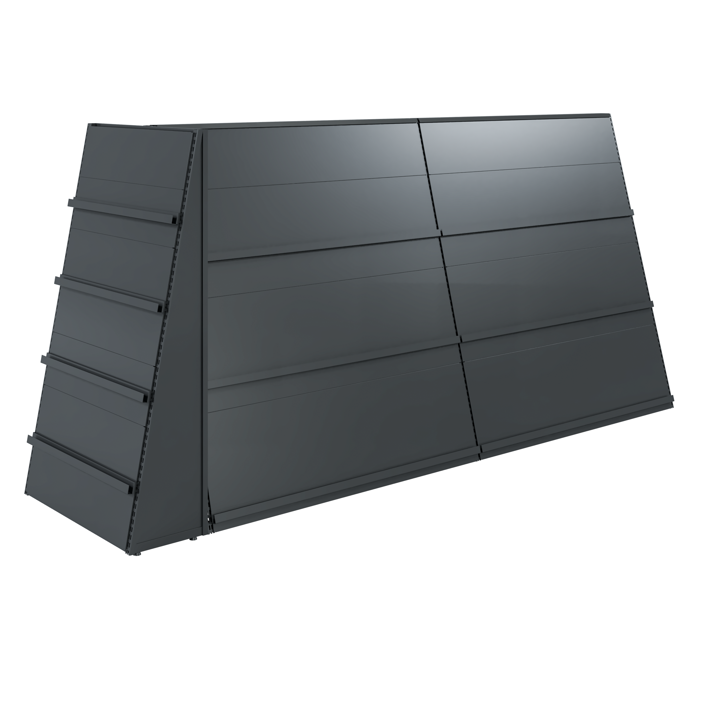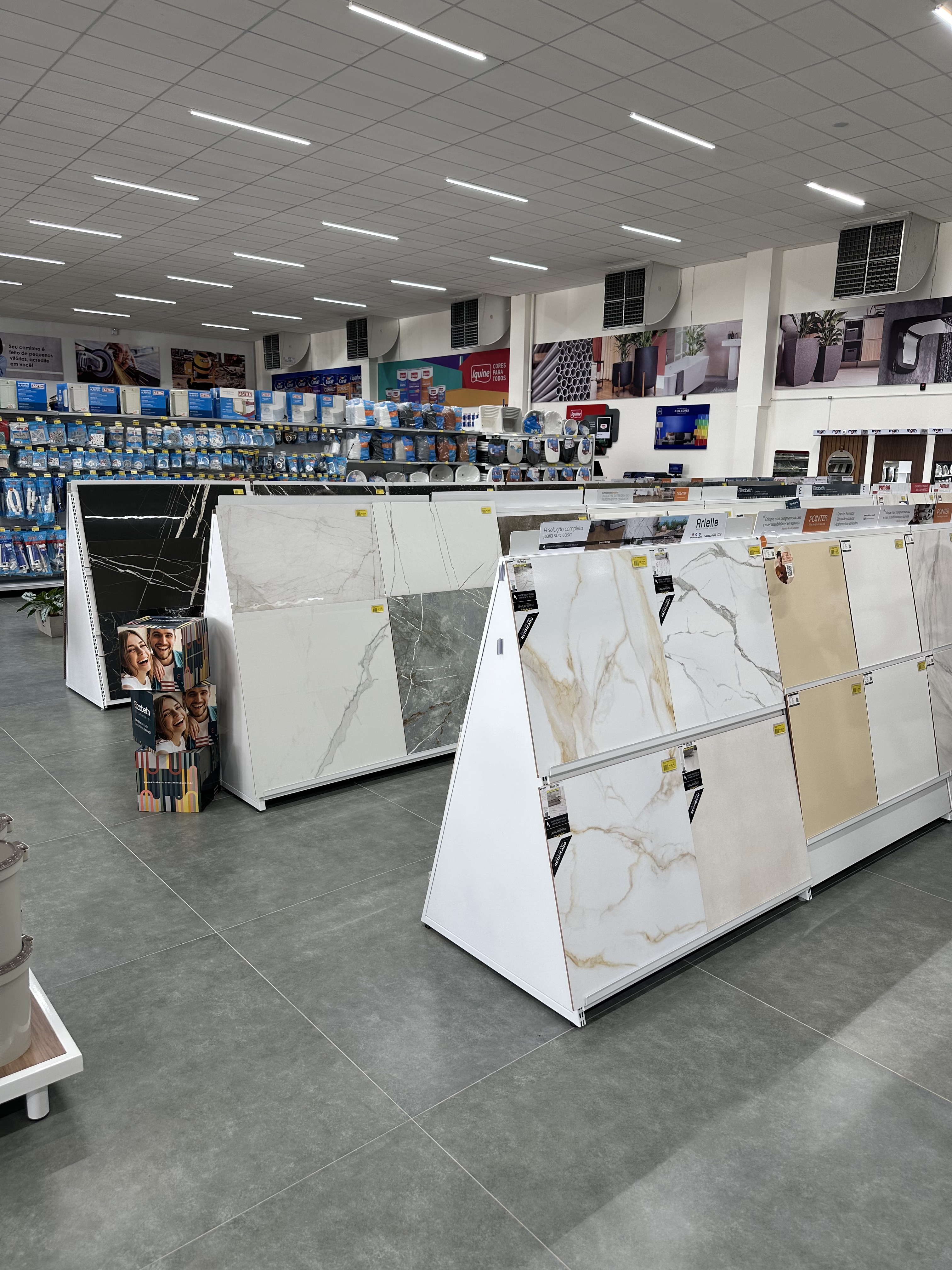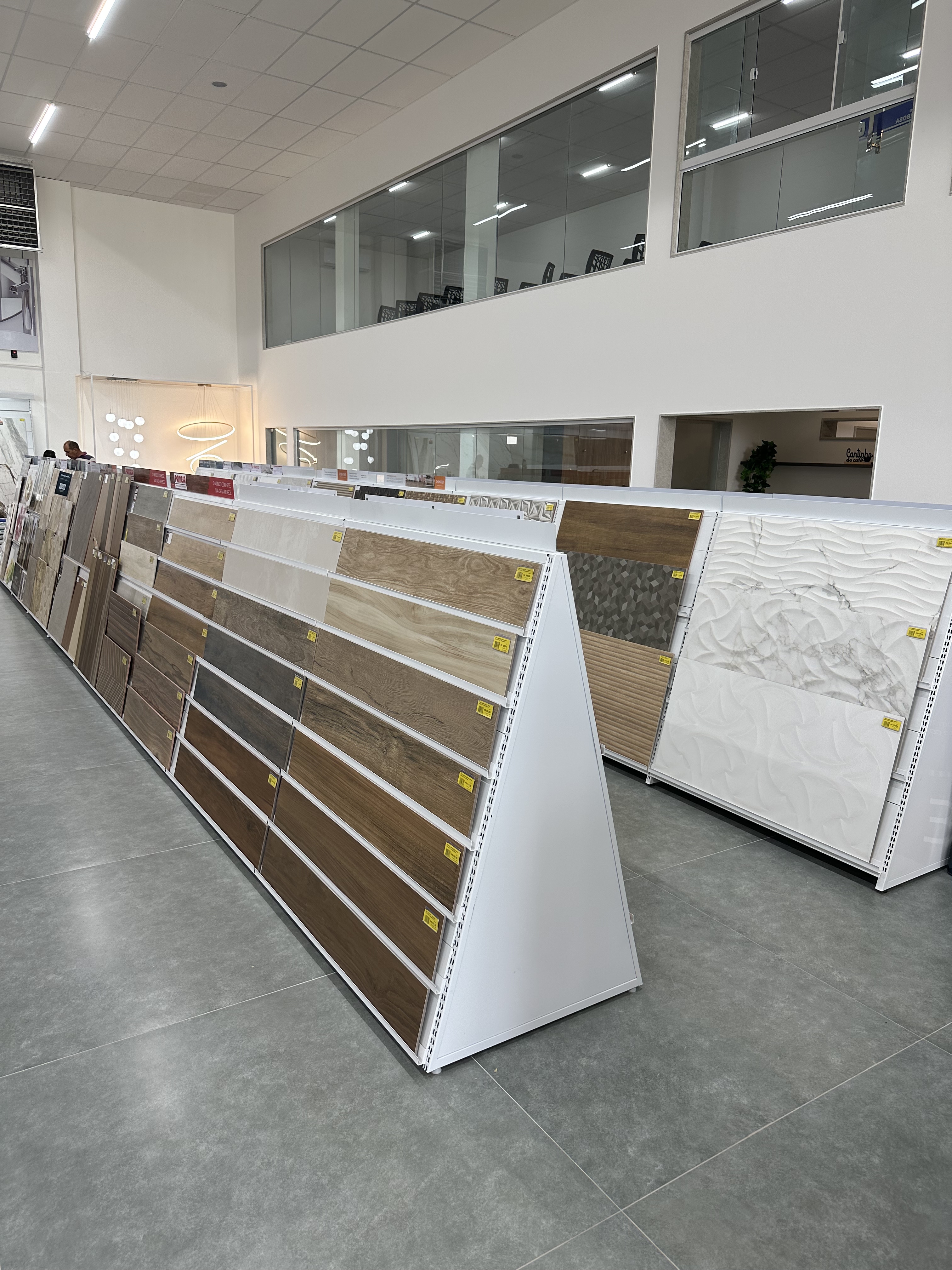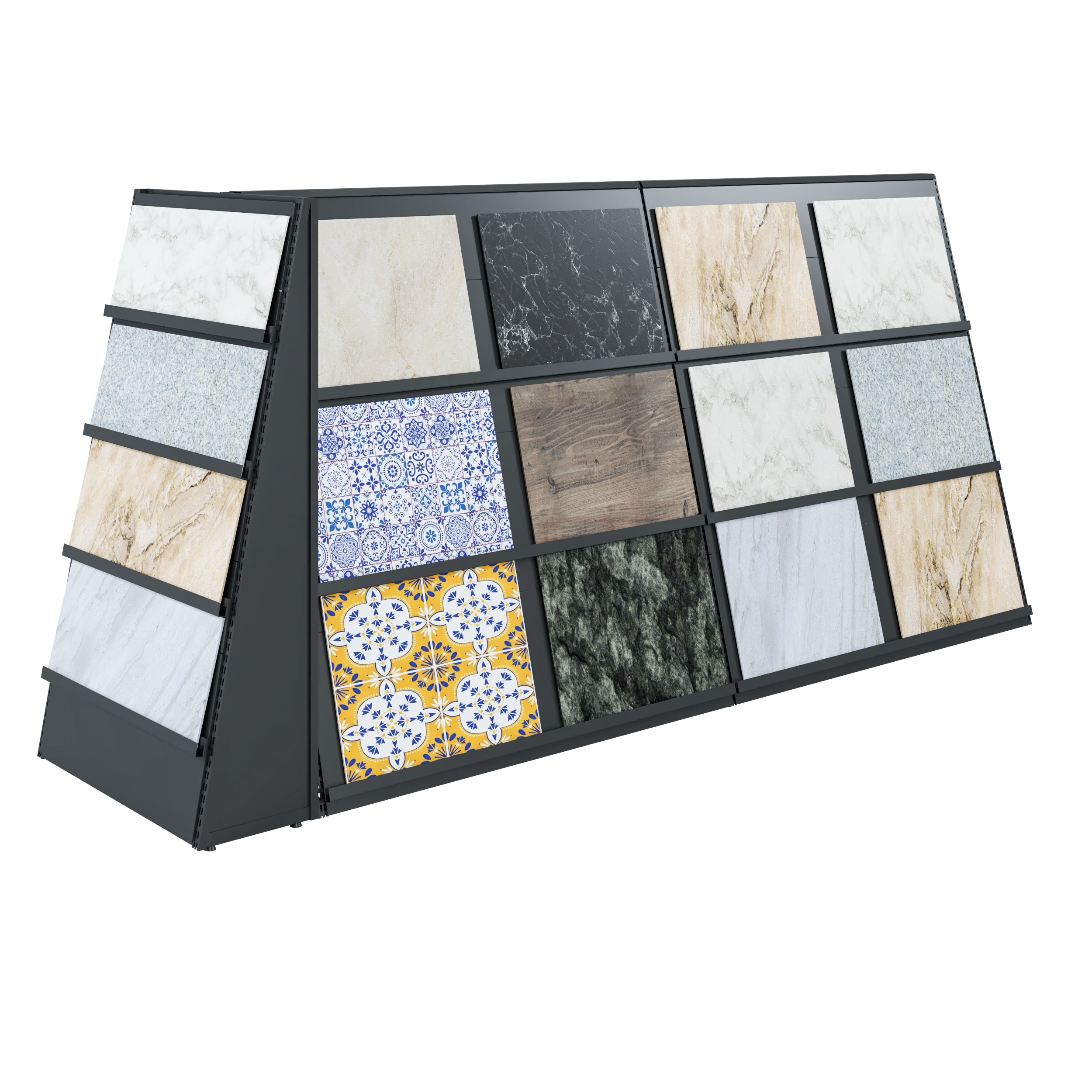 Gôndola expositora de piso confeccionada em estrutura de aço carbono, com réguas para suporte dos revestimentos e pés niveladores de altura.