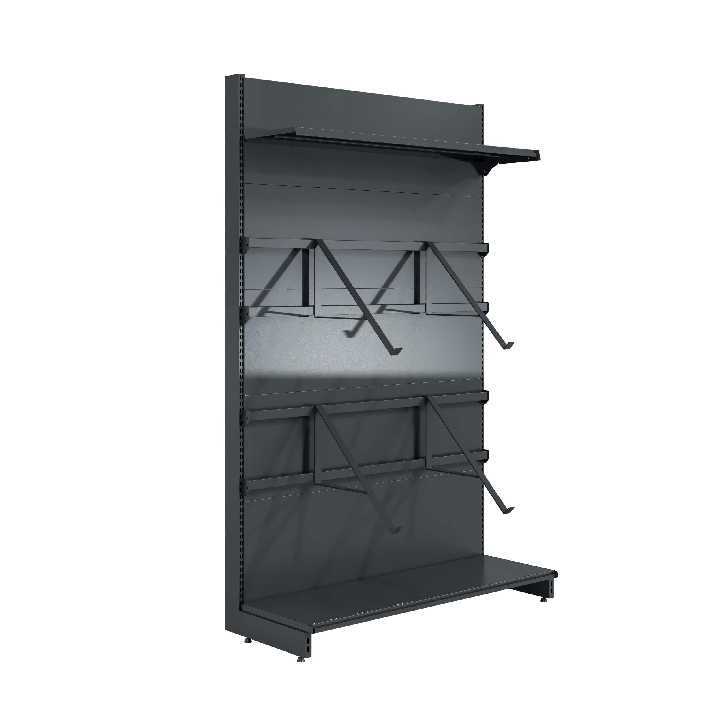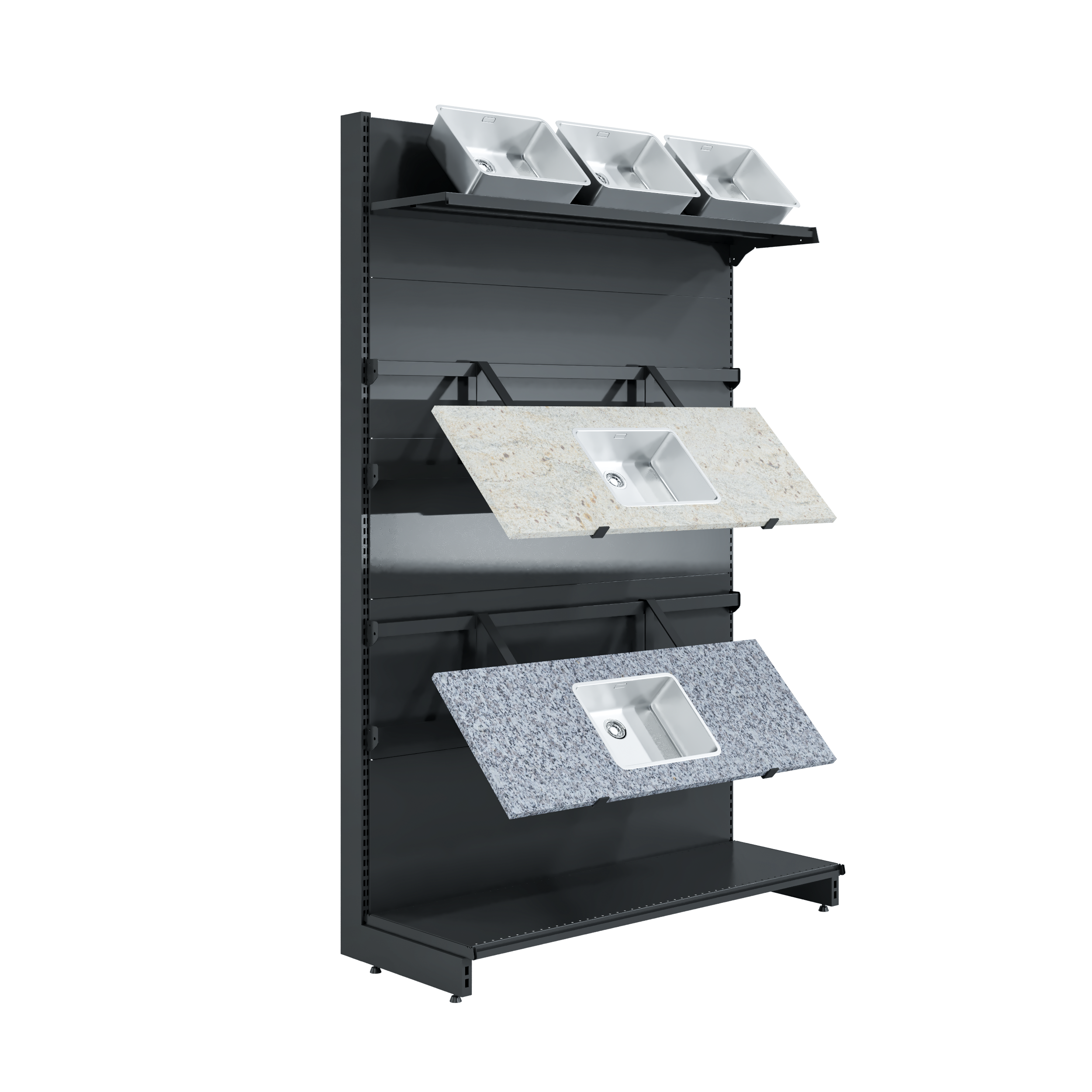 Expositor lateral, confeccionado em estrutura de aço carbono. Suporte para expor pias com possibilidade de regulagem do nível de exposição e pés com regulagem de altura.