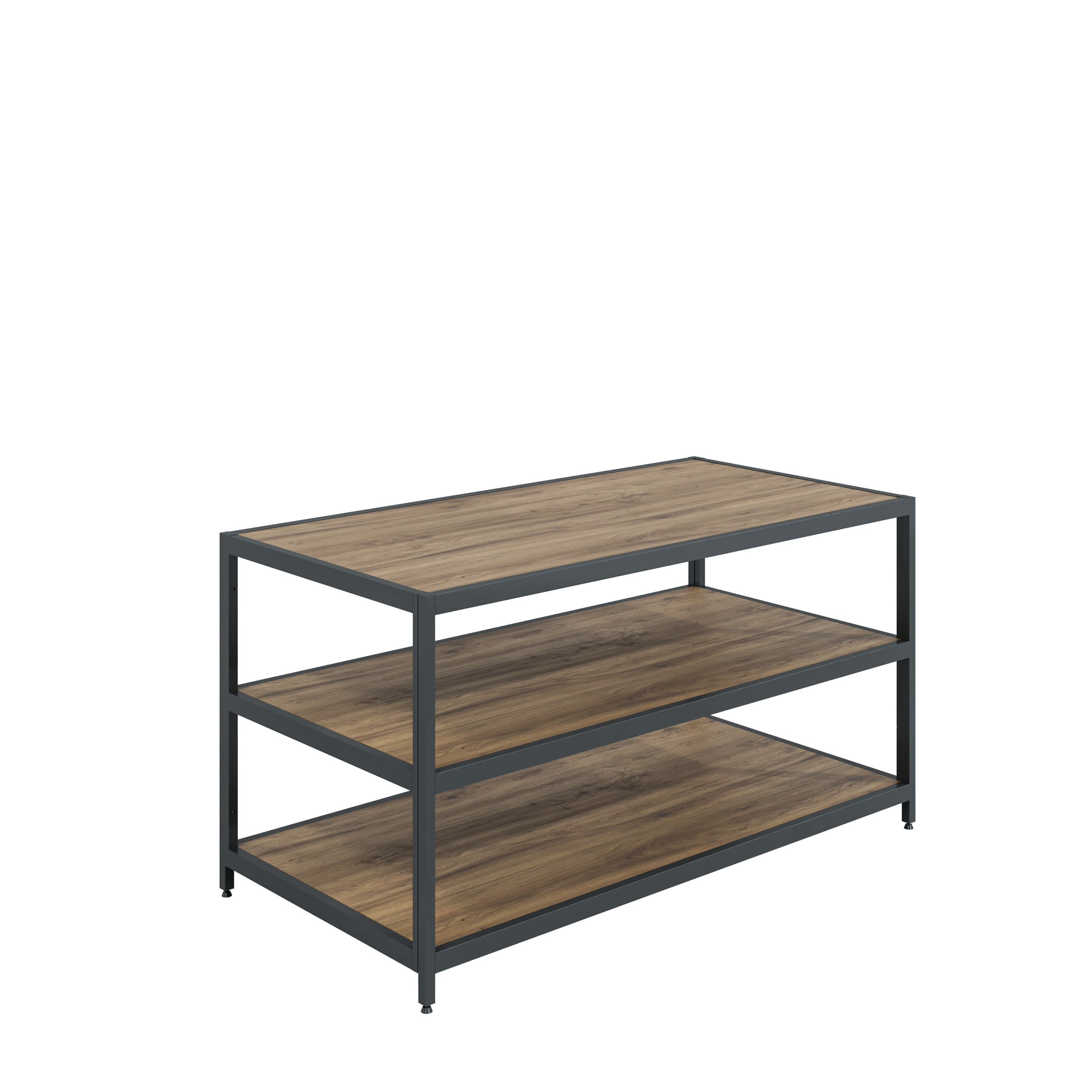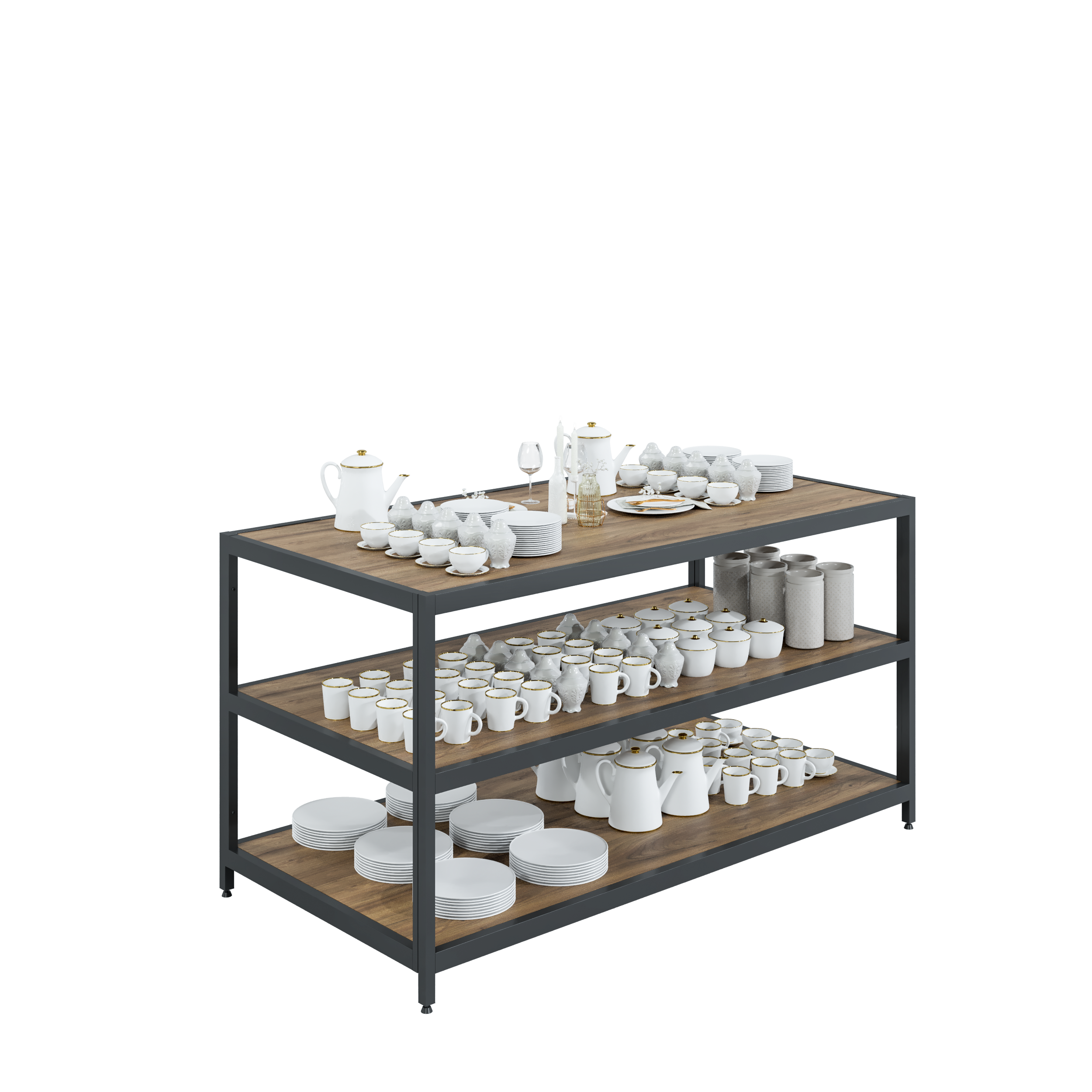 Mesa confeccionada em estrutura de aço carbono, revestida com tampo de MDF, com 3 níveis de exposições e pés niveladores de altura.