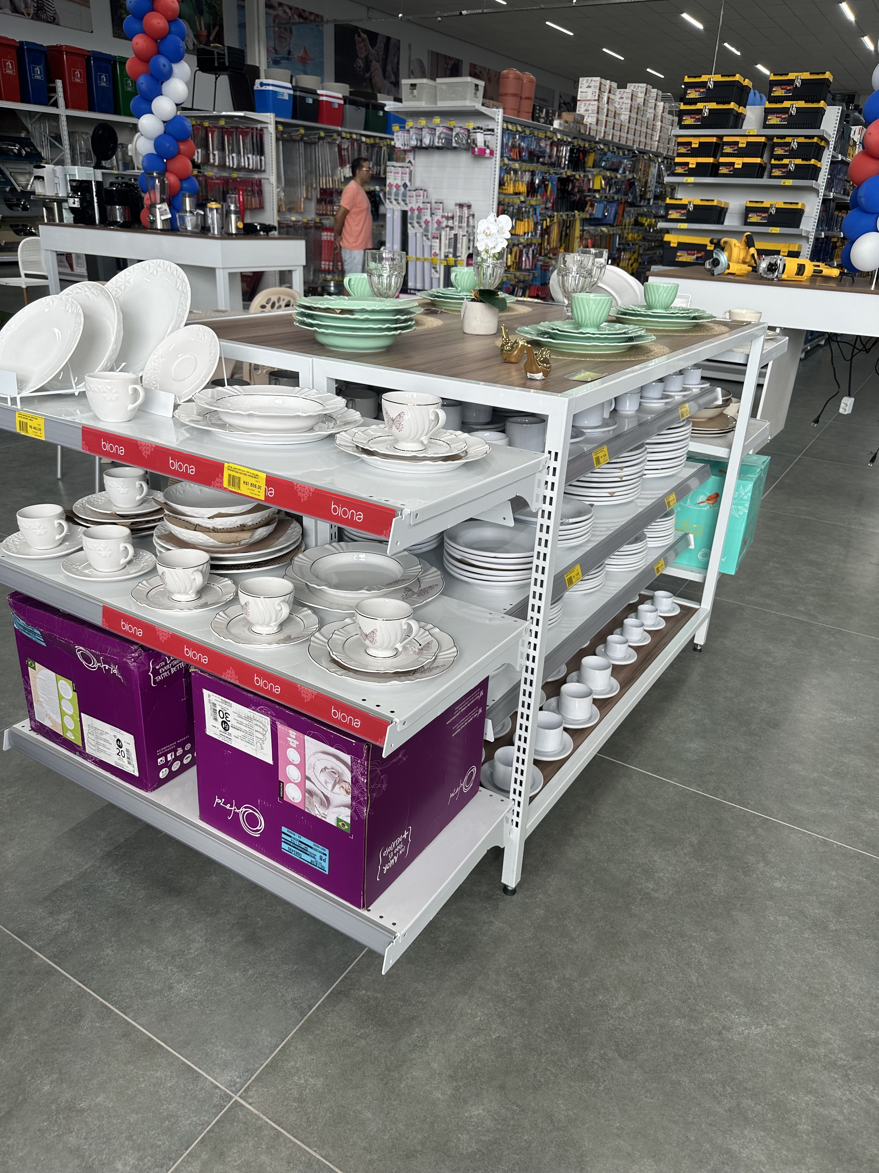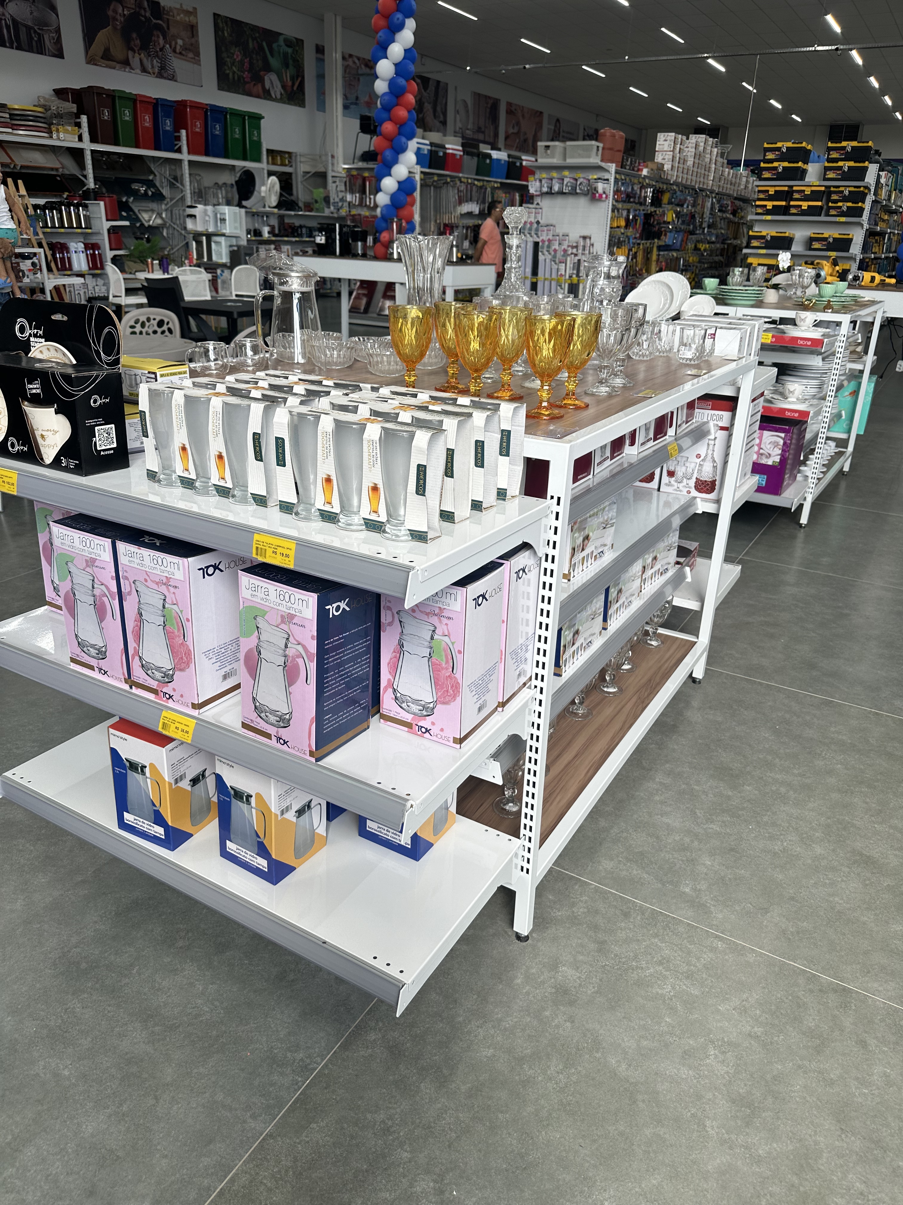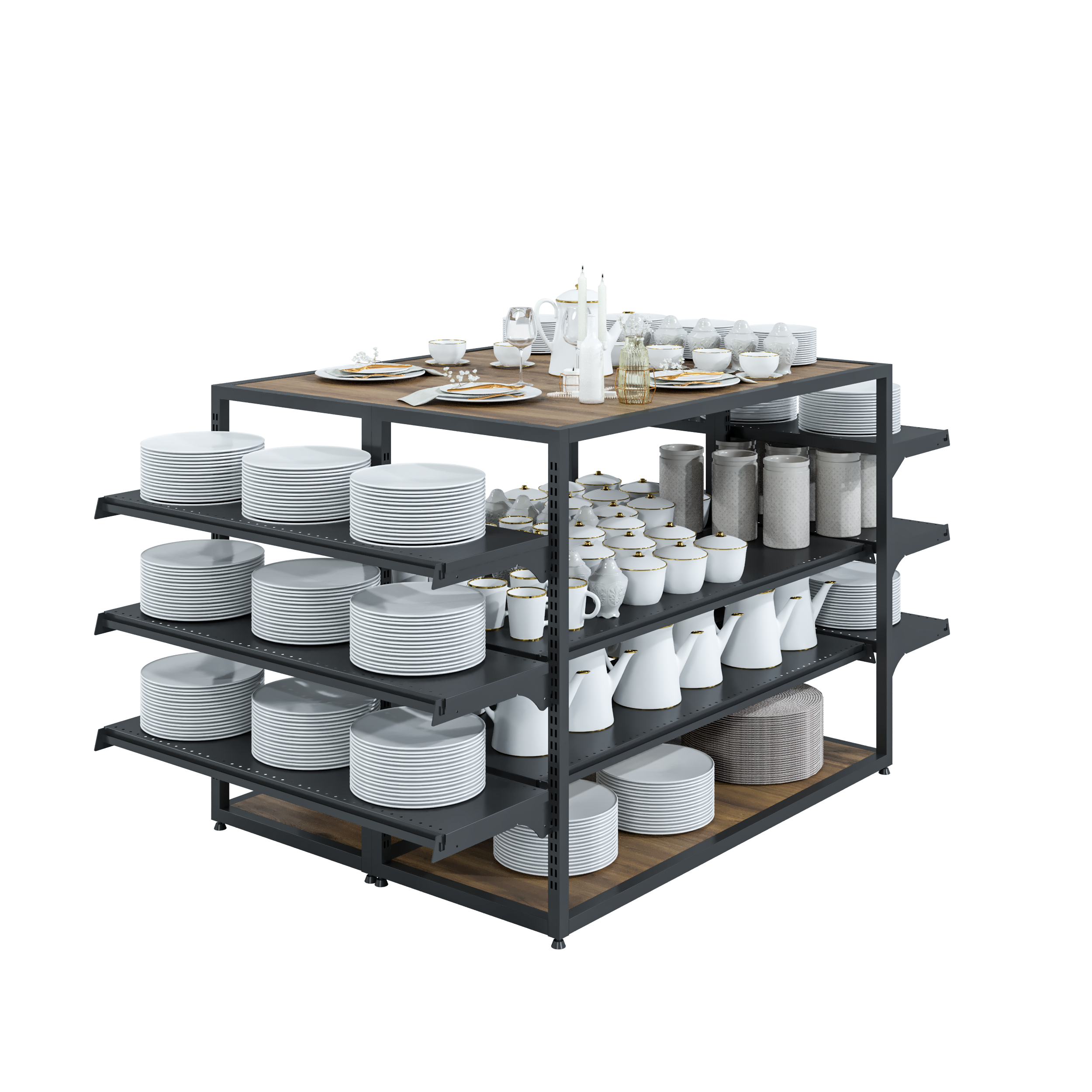 Mesa expositora central para uso diverso, confeccionada em estrutura de aço carbono, revestida em MDF, com prateleiras de níveis reguláveis e pés com regulagem de altura.